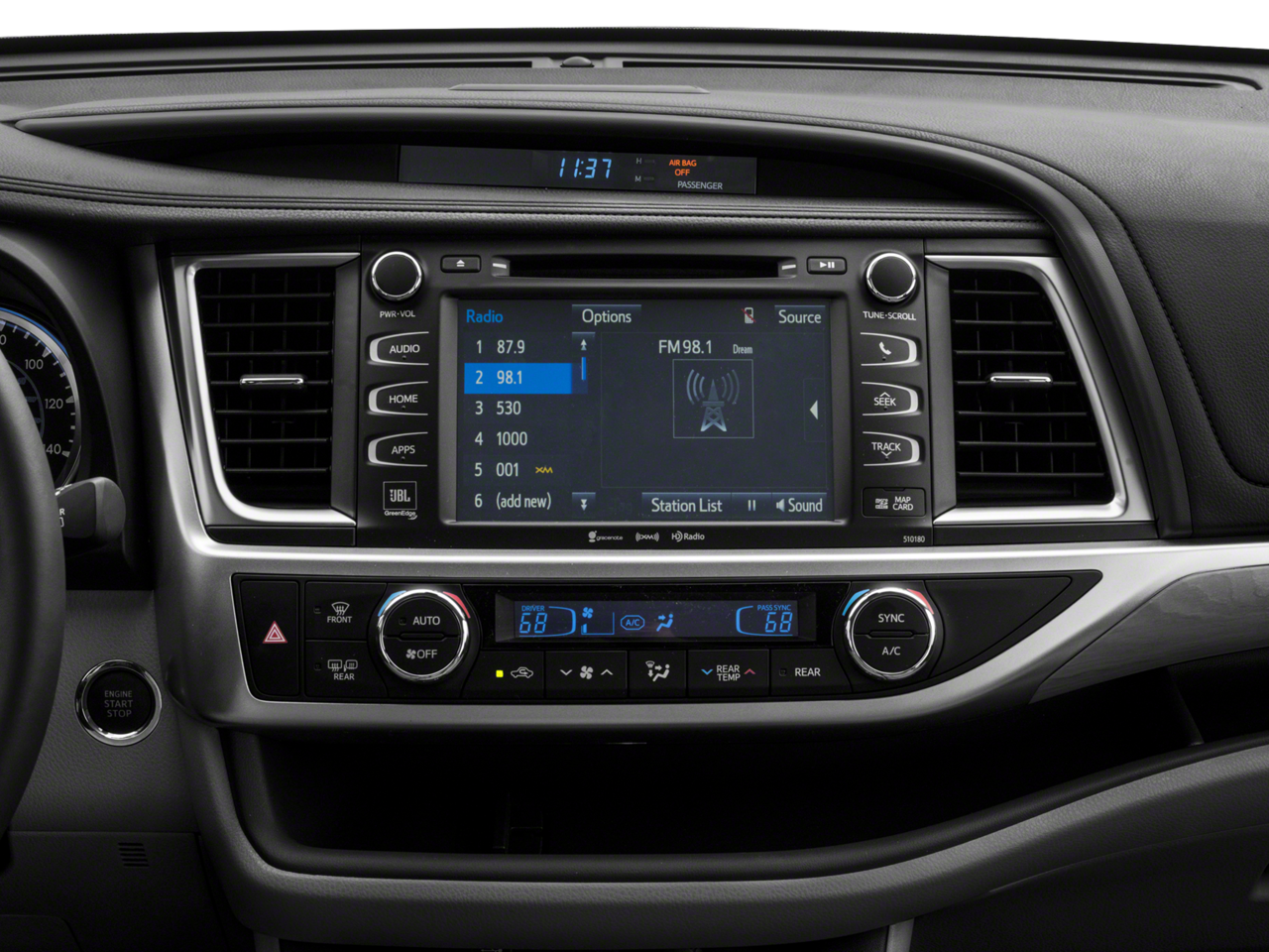 • Radio: Entune Premium JBL Audio w/Nav & App Suite -inc: the Entune Multimedia Bundle (8" high resolution touch-screen w/split screen display, AM/FM CD player, MP3/WMA playback capability, 12 JBL GreenEdge speakers, auxiliary audio jack, USB 2.0 port w/iPod connectivity and control, advanced voice recognition, hands-free phone capability, phone book access and music streaming via Bluetooth® wireless technology), Siri Eyes Free, Entune App Suite, Intelligent Touch controls, SiriusXM Satellite Radio w/3-month complimentary SiriusXM All Access trial, HD Radio, HD Radio predictive traffic and Doppler weather overlay, AM/FM cache radio, Gracenotes album cover art and integrated backup camera display w/dynamic gridlines